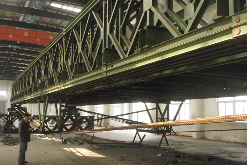 Nossa empresa, por meio de esforços conjuntos com 4 supervisores de doutorado e um grupo de estudantes da especialidade Engenharia de Estradas e Pontes da Universidade de Ciência e Tecnologia de Nanjing, desenvolveu e testou com sucesso um sistema de elevação de tensão da Ponte Bailey de grande vão. O modelo de ponte experimental tem 51m, com capacidade de carga de 60 toneladas. A estrutura da Bailey Bridge é uma estrutura Tipo 321 de três fileiras, um andar, reforçada e de pista única. Originalmente, esta estrutura de 51m atingiu o seu limite carregando apenas algumas toneladas. No entanto, através do sistema de contra-tensão desenvolvido em conjunto pela nossa empresa e pelos professores da NJUST, esta estrutura da Bailey Bridge é capaz de satisfazer a passagem suave de uma carga de 60 toneladas. Isso abriu oportunidades prospectivas inteiramente novas para os cenários de aplicação de Bailey Bridges de grandes vãos e cargas pesadas. As imagens acima mencionadas mostram o processo de experimento, demonstração, processamento, produção experimental, montagem e aceitação final de nossa empresa.